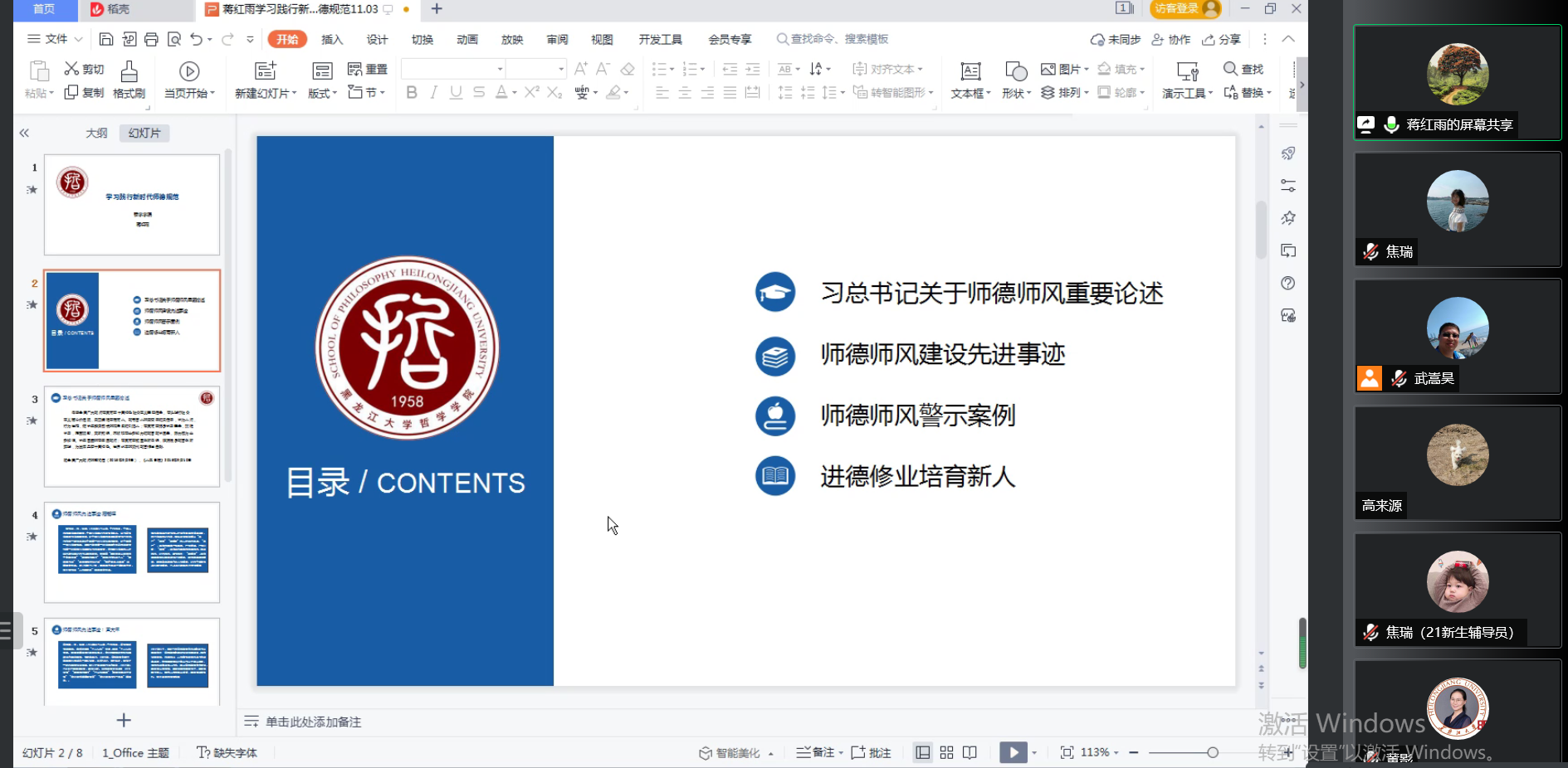 随后,大家共同学习了师德师风先进典型事迹。蒋红雨谈到,黄大年以身许国、无怨无悔,用实际行动诠释了爱国之心、强国之志、报国之情,为广大知识分子树立了光辉的榜样;高铭暄作为新中国刑法学的主要缔造者、新中国第一代法学教育家的代表、新中国建设的“最美奋斗者”,他创造性地总结出“三严”、“四能”、“五结合”的人才培养之道,是员工们衷心爱戴的老师、工作生活的楷模和永远的精神力量。