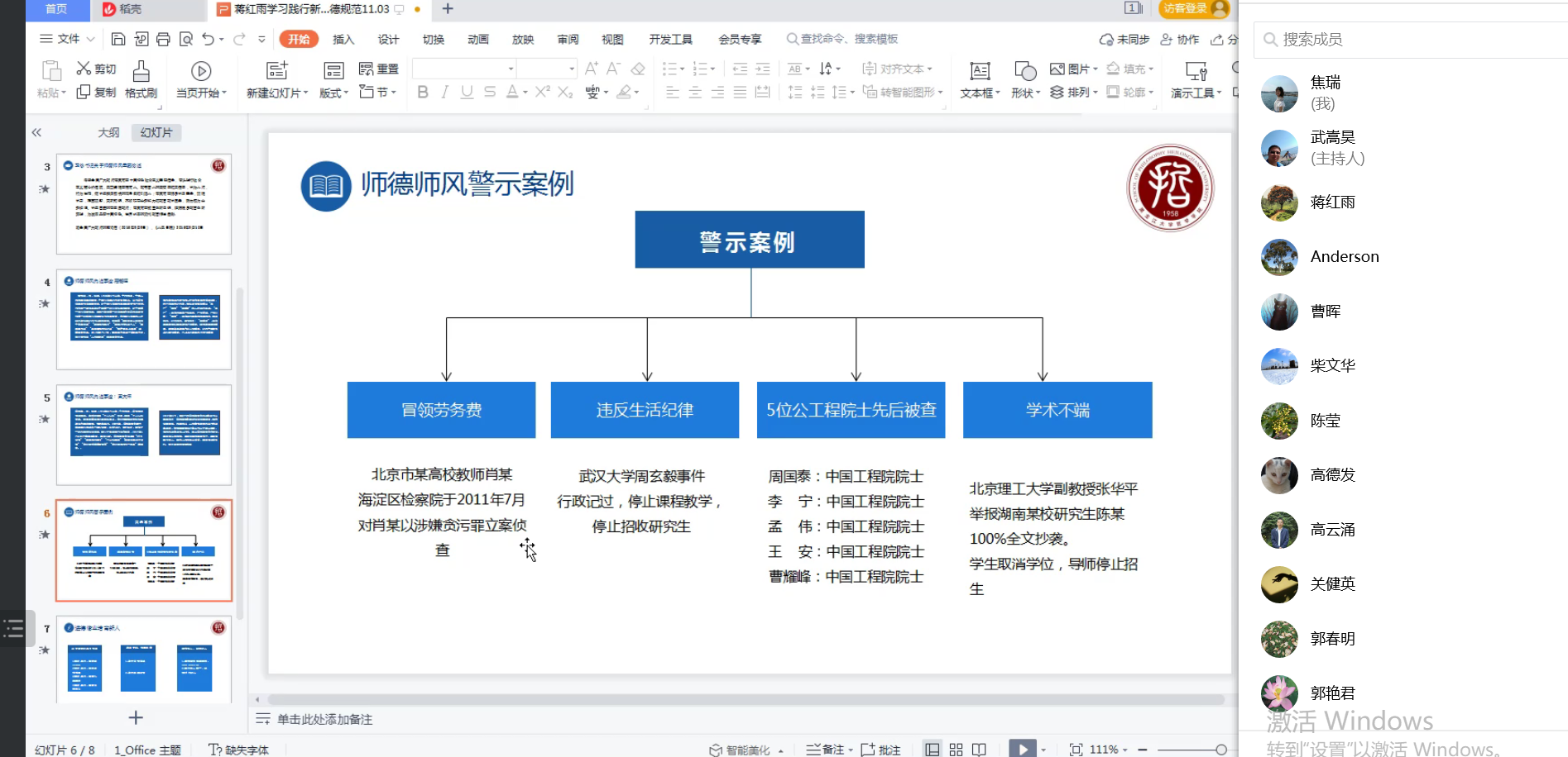 接下来,蒋红雨又列举了冒领劳务费、违反生活纪律、学术不端等几类师德师风反面警示案例,要求全体教师保持清醒头脑,牢固树立底线思维,高度敬畏师德红线,规范从教行为。