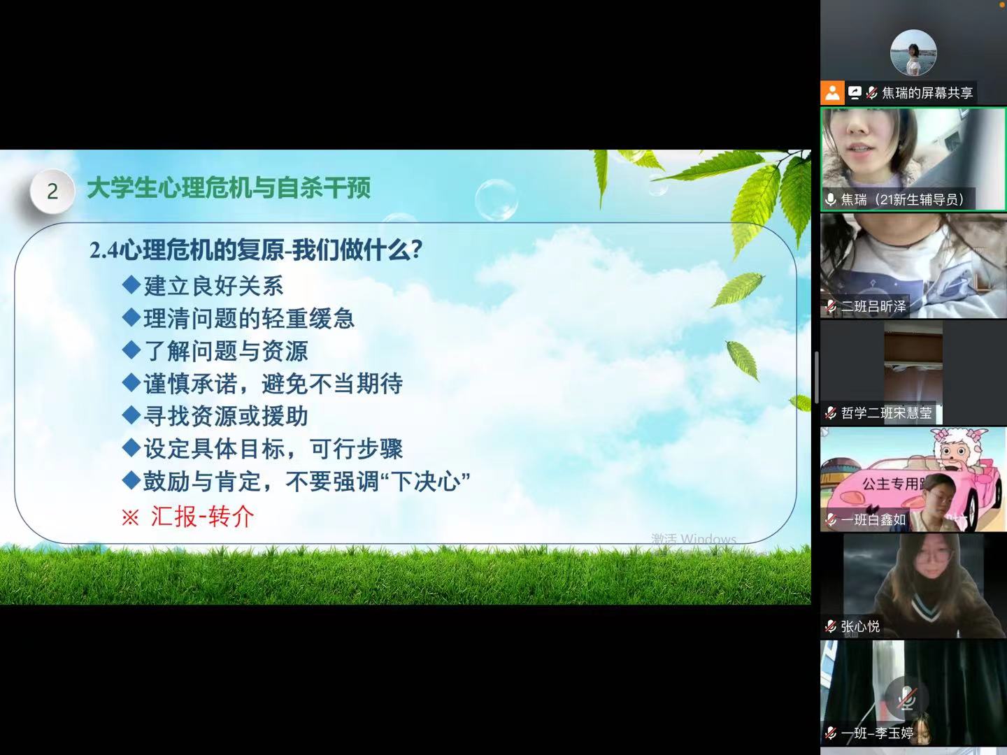 第三,焦老师普及了与老员工心理危机与自杀干预的相关知识。在这个环节,同学们认识到了心理危机的影响及复原方法,了解了自杀的预防与干预,对于自杀的常见误解,提高了对自杀进行干预与预防的能力。焦老师强调,请大家记住“这总会过去”,一切事情都会过去,不要采取冲动鲁莽的行为,这对自己及家人都是巨大的伤害。