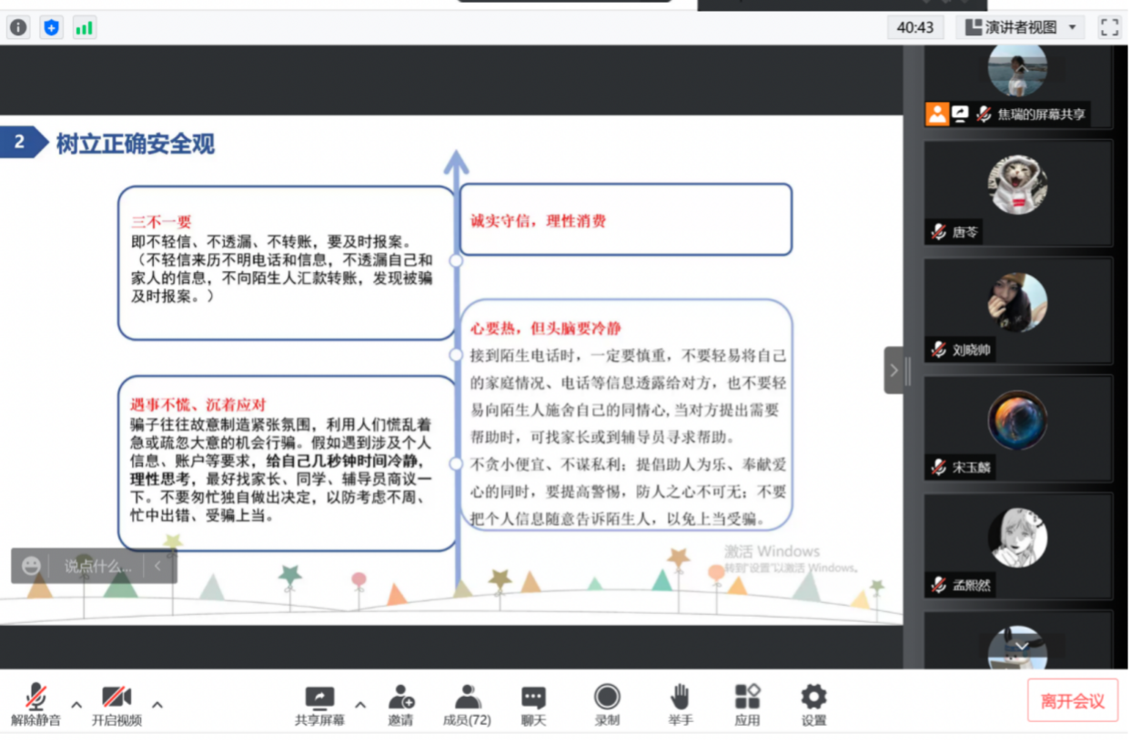 最后,焦老师教育我们要树立正确安全观,要做到“三不一要”即不轻信、不透漏、不转账,不要轻易点开来历不明的信息,也不要把个人信息发给陌生人,要及时报警,诚实守信,理性消费,遇事不慌、沉着应付,心要热,但头脑要冷静;不贪小便宜、不谋私利,提倡助人为乐、奉献爱心的同时,要提高警惕,防人之心不可无,不要把个人信息随意告诉陌生人,以免上当受骗。