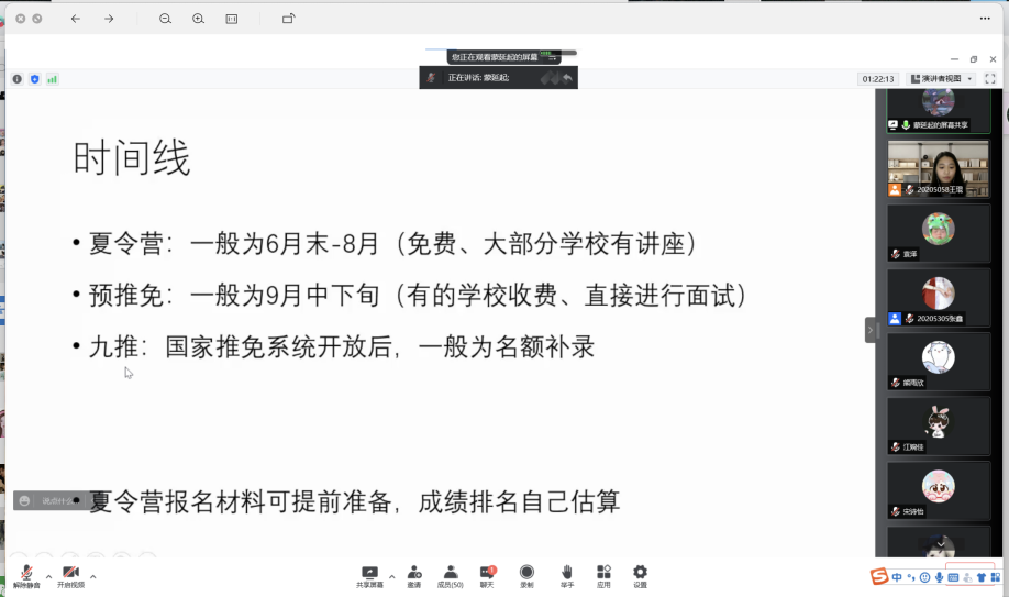 接着,蒙延起学长主要介绍了保研的基本流程。其主要分为6月末到8月的夏令营,9月中下旬的预推免和9月正式推免。学长强调在准备夏令营材料的时候,要准备好自己的个人资料,主要是一些成绩排名、获奖经历以及四六级成绩等。学长也提了一些个人的建议,他认为我们最好要有保底的公司,因为有的公司发的夏令营offer没有效力。同时,他也强调到我们心态不要过分紧张,然后如果答应了对方公司,就尽量不要食言,以及我们在准备保研的同时也要准备一些考研的科目,以备无患。