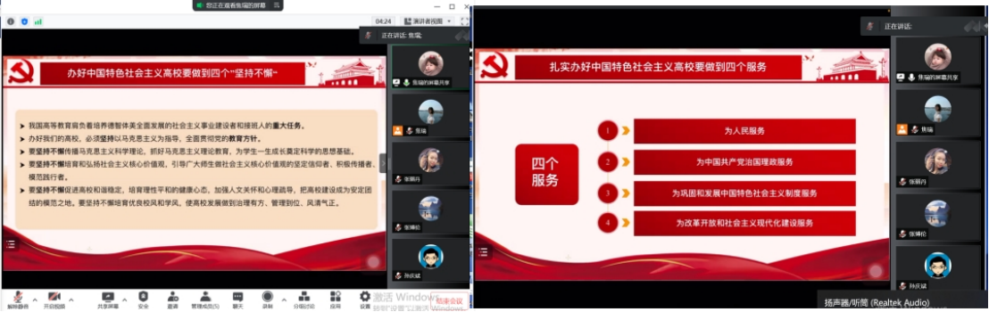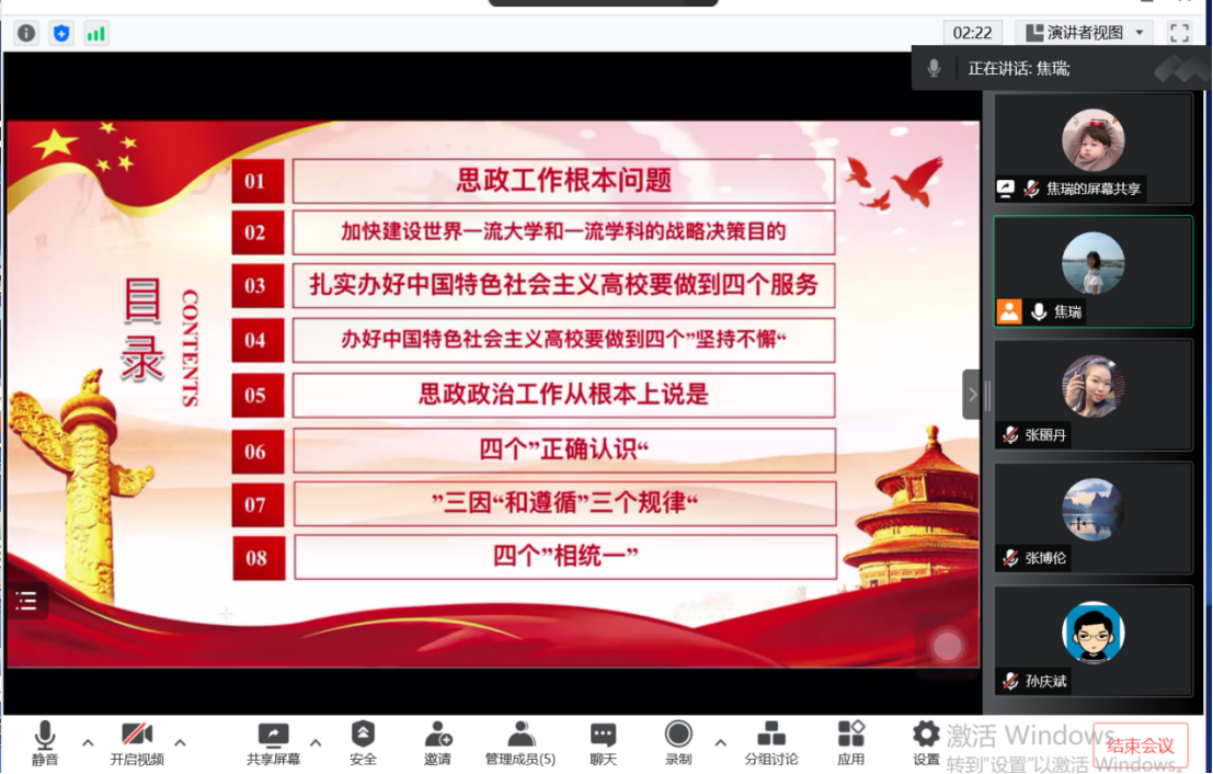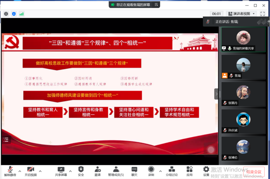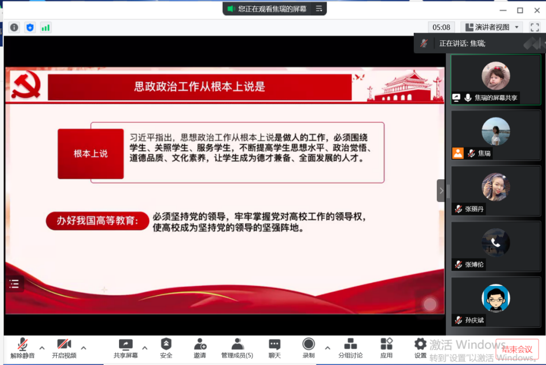 为提高员工工作队伍思想理论水平,筑牢信仰之基,进一步提升能力、锻造作风、实干立身、为国育才,把思想政治工作贯穿公司产品全过程,助力高等教育事业发展新局面,ladbrokes立博员工工作队伍于6月27日开展《习近平在全国高校思想政治工作会议上的讲话》集中学习会。公司党总支副书记张丽丹老师主持,19级辅导员孙庆斌老师、18级20级辅导员张博伦老师、21级辅导员焦瑞老师参加会议。