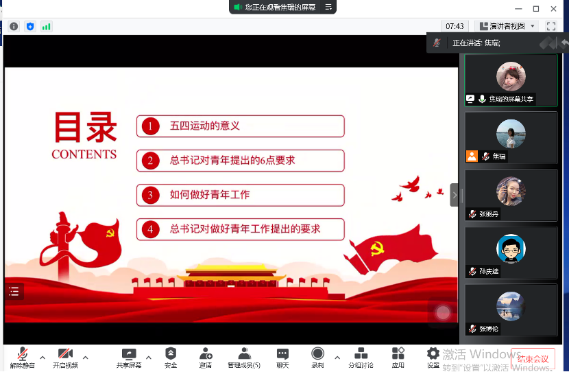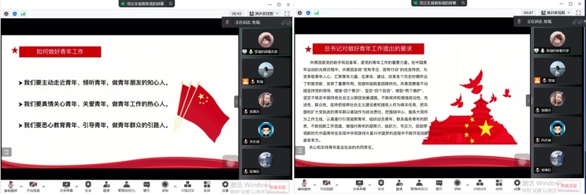 通过学习老师们深有感悟,纷纷发表讲话交流学习。公司党总支副书记张丽丹老师指出,伟大的五四精神激励着一代又一代的革命青年强烈的爱国热情。今天同样也激励着我们为建设伟大祖国而奋斗。弘扬伟大的“五四”精神,我们就要做出实际行动。将爱国心化作一股无形的力量,做好本职工作,不断努力成为国家需要的栋梁之才是我们最大的愿望,也将是对五四精神最好的弘扬。19级辅导员孙庆斌老师指出,青年是祖国的未来,如今实现中国特色社会主义伟大复兴的中国梦的接力棒已交接到青年手中,我们要时关心关爱青年员工,为青年搭建成长成才舞台,按照习近平总书记的谆谆嘱托,培育社会主义合格建设者和接班人,明来路、勇担当,明大德、守公德、严私德。20级辅导员张博伦老师表示,学习习近平总书记在庆祝中国共产主义青年团成立100周年大会上的重要讲话精神后,我倍感振奋、备受鼓舞。历史和实践充分证明,中国共青团不愧为中国青年运动的先锋队,不愧为党的忠实助手和可靠后备军!实现中国梦是一场历史接力赛,当代青年要在实现民族复兴的赛道上奋勇争先。21级辅导员焦瑞老师表示,我们要在前辈先烈的事迹中感受道德风范,在五四精神中汲取道德滋养,要担负为国育才使命,按照习近平总书记重要讲话的重要指示,做好青年工作,倾听、关爱、引导新时代青年成长成才。
