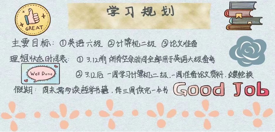 通过一份精细的学习规划可以让同学在学习中动力满满,按部就班完成每一个小目标。百围之木,始于勾荫;万里之途,起于跬步。从小事做起,从点滴积累,相信收获就在不远的明天!