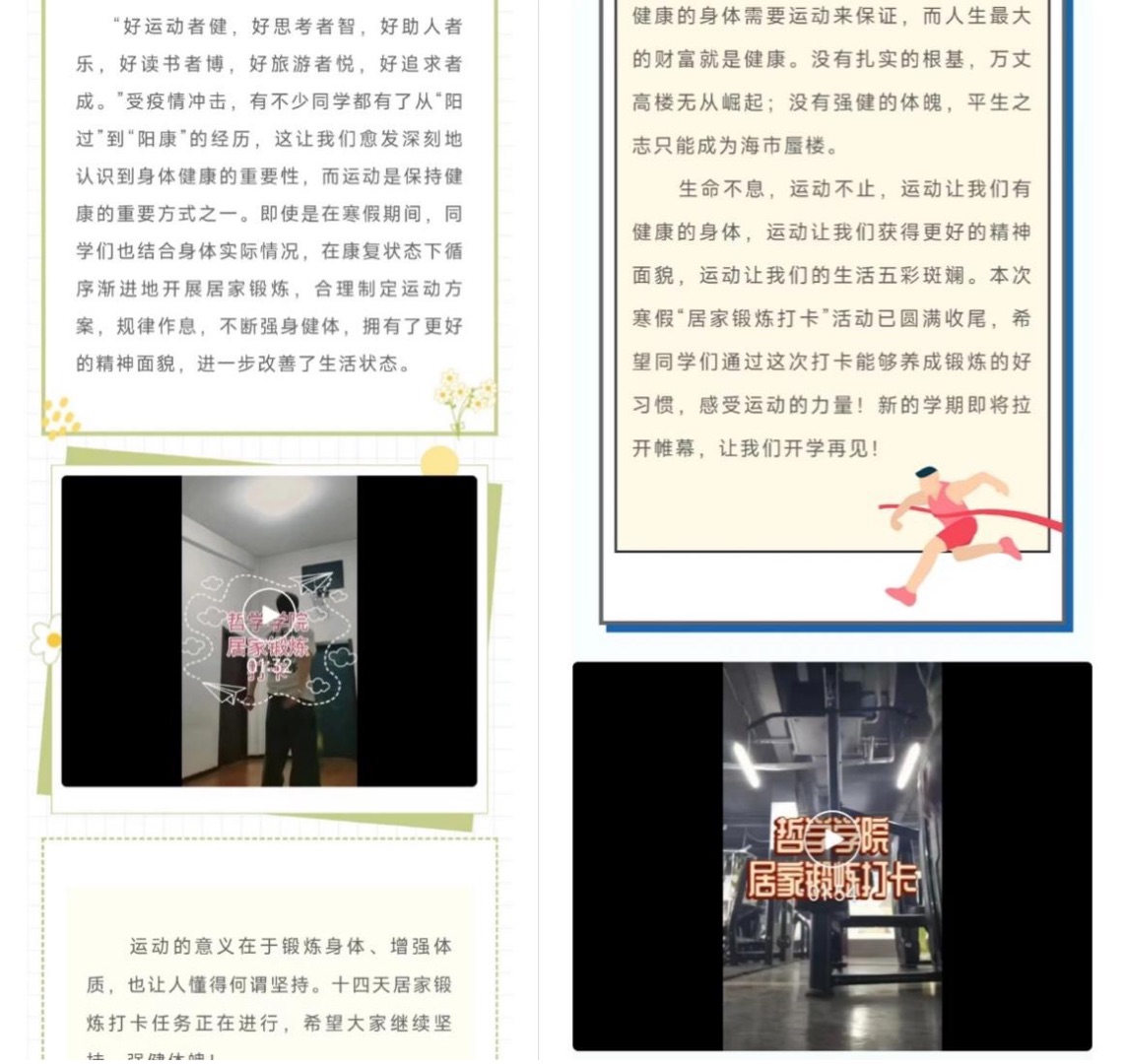 健康的身体需要运动来保证,而人生最大的财富就是健康。没有扎实的根基,万丈高楼无从崛起;没有强健的体魄,平生之志只能成为海市蜃楼。生命不息,运动不止,运动让我们有健康的身体,运动让我们获得更好的精神面貌,运动让我们的生活五彩斑斓。本次寒假“居家锻炼打卡”活动已圆满收尾,希望同学们通过这次打卡能够养成锻炼的好习惯,感受运动的力量!