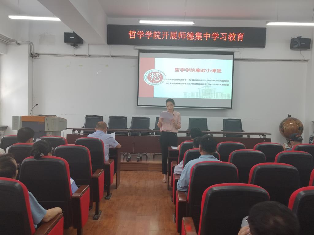 张丽丹副书记传达了《教育部公开曝光第十一批7起违反教师职业行为事项准则典型案例》和《教育部公开曝光第十二批7起违反教师职业行为事项准则典型案例》两个文件,重点向各位教师通报了涉及到高校的四个案例,通过讲解案例加强警示教育,引导各位教师引以为戒,坚决不触碰道德底线。