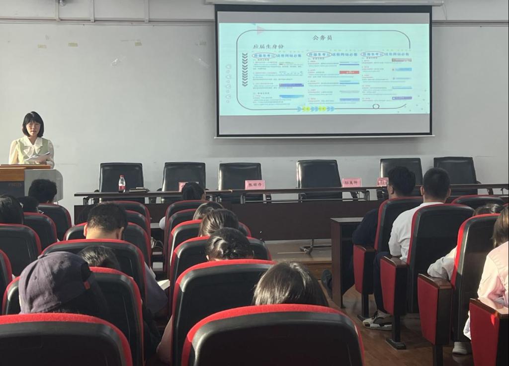 焦老师指出大三是明确方向、梦想启航的关键一年,2021级辅导员焦老师从就业方向进行指导,并从各个就业方向如何获取信息、需要具备的基本条件进行讲解。保研方面,讲解了往届保研的类别、推荐标准与实施细则;考研方面,强调要做到信息对称和找准定位,并介绍了要大量搜索信息、搜索公司、考试大纲、报录比、历年真题,精准定位适合自己的专业;基层项目方面,讲解了非定向选调生、三支一扶、特岗教师的招聘流程、基本条件;公务员报考方面,提醒同学们抓住应届生身份,介绍了各省报考网站;协议就业方面,介绍了常用的获取就业信息渠道、线下线上平台。