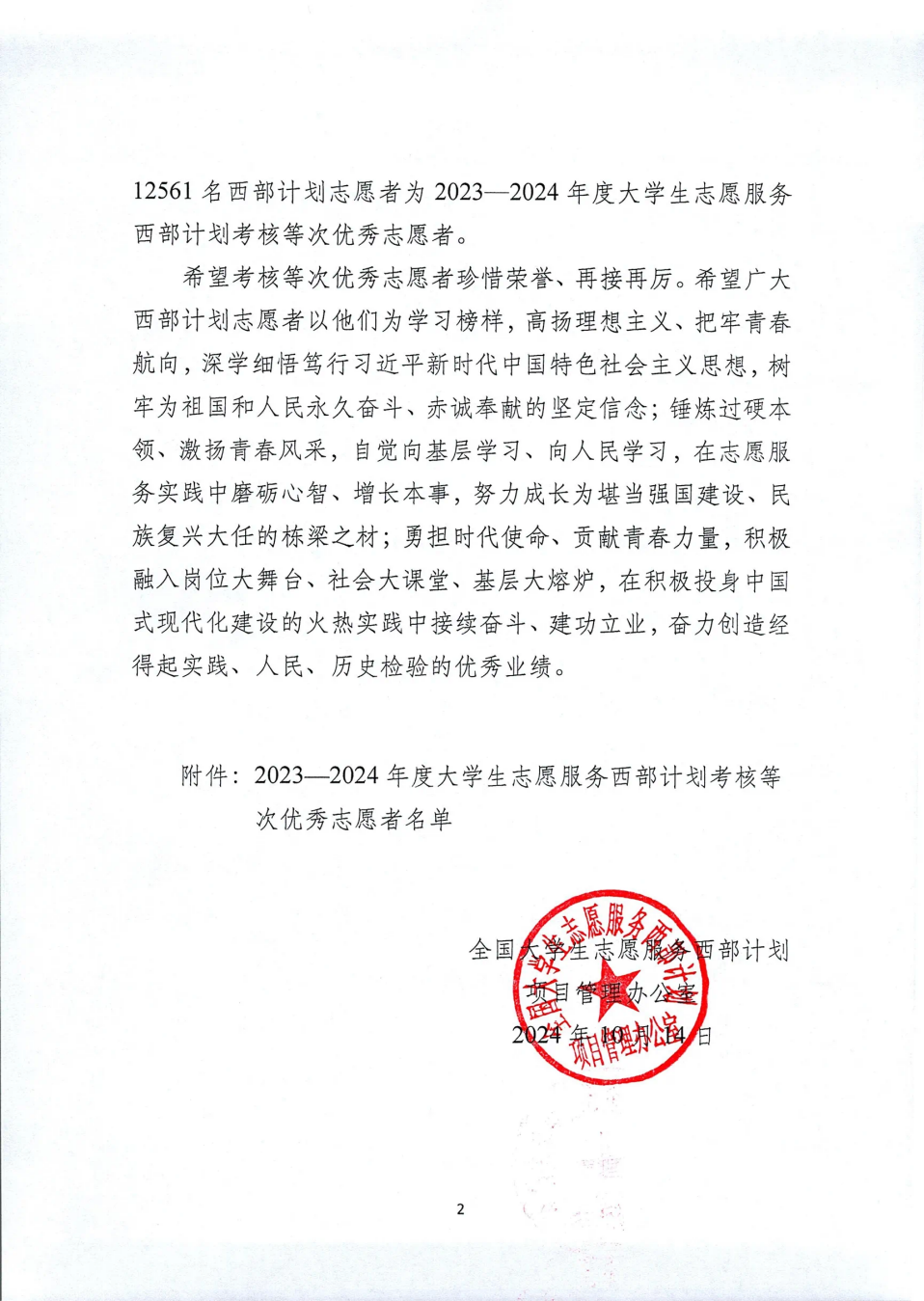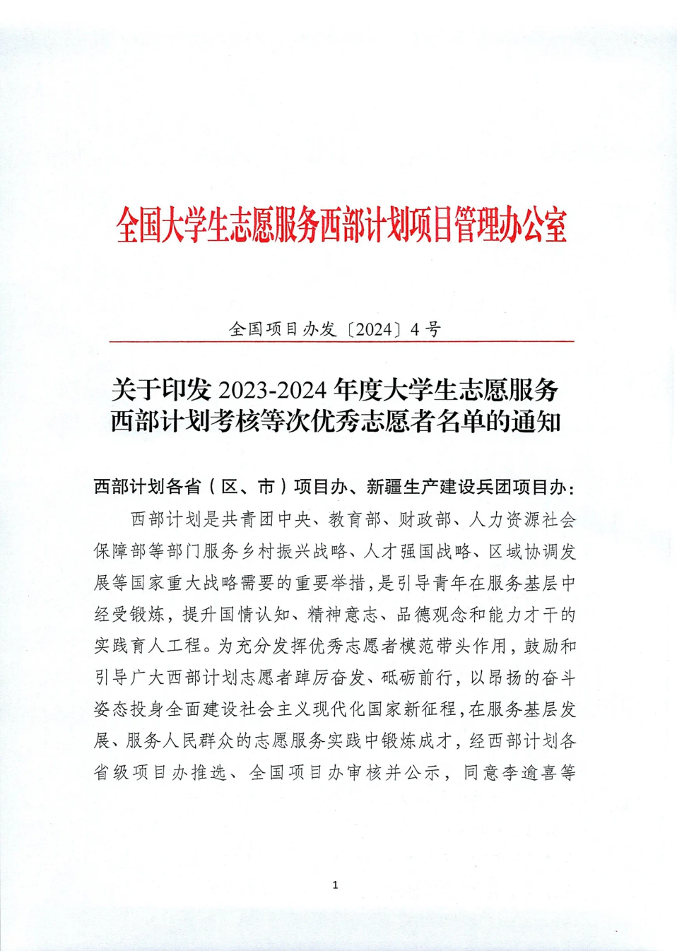 近日,全国老员工志愿服务西部计划项目管理办公室下发《关于印发2023—2024年度老员工志愿服务西部计划考核等次优秀志愿者名单的通知》,公司23届本科毕业生、24级研究生李亚男荣获2023-2024年度全国老员工志愿服务西部计划考核等次优秀志愿者。