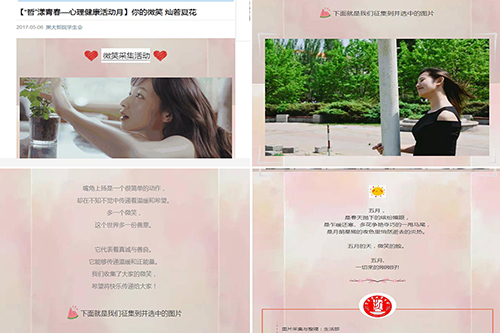 微笑是人最美好的部分,代表着真诚与善的微笑是展示个人的一种方式,能够带给人们温暖和正能量。公司员工会面向全体同学发出了采集微笑照片的倡议和邀请,并将其发布在公司微信公众平台上,将快乐的信念和关注心理健康的理念传播出去。邀请发出之后,同学们积极响应,纷纷将最美的笑容用照片定格。截止2017年4月29日,活动共收到同学们的微笑照片百余张。在上传的微笑照片中,有劳动中的微笑、有感动中的微笑、有关怀的微笑……一张张微笑照片透露出来的是同学们心理积极向上、阳光快乐的内心世界。经过筛选,有十余张经典、具有代表性的照片被推送在ladbrokes立博员工会微信公众平台上。本次活动受到了同学们的广泛支持,活动效果良好。