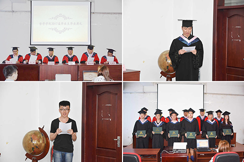 本次典礼以一段温馨感人的视频开场,视频记录了大学四年里的点点滴滴,有友情、爱情,还有师生情,在场的人无不为之感动。随后,全体师生起立,唱国歌,场面庄严肃穆。王秋老师向大家宣读了毕业资格审查报告及学位审批报告后,孙庆斌书记对获得优秀毕业生荣誉称号的同学进行表彰,并鼓励毕业生要以其为榜样修身立德、博学致远。蒋红雨老师宣读了表彰考取硕士研究生同学的决定,希望他们能够再接再厉,取得更优异的成绩。接下来,公司领导及教师代表为全体毕业生颁发了毕业证书,每个人拿到毕业证书后都无比激动,这个证书不仅意味着他们圆满的完成了大学本科四年的学业,也预示着他们即将离开母校,奔向更远的目标。