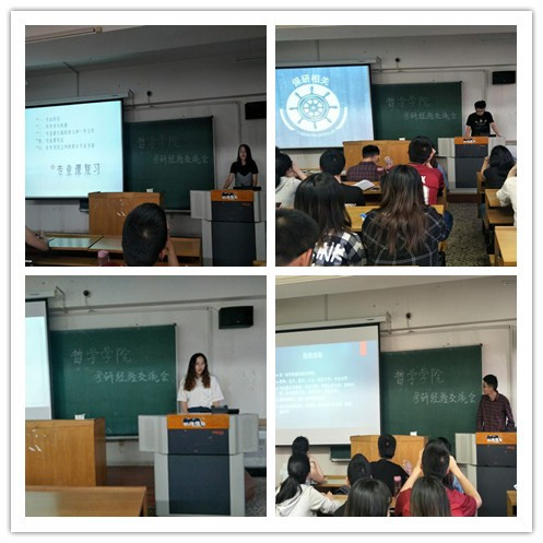 第二部分是考研经验分享,由马文惠、杨思怡同学着重介绍考研心得,涵盖了考研动机、院校选择、报考方向,复习方法、心态与调整等方面。14级的同学们提出了考研要面临的几个问题:第一是“考什么”,明确了考试内容才能提高复习的效率;第二是“参考用书”,列出了一些书籍供大家参考选择;第三是时间管理,告诫同学们要把考研复习分成四个时间段,从定下目标的阶段,到坚持备考阶段,这是一个需要坚持的时期,之后日复一日的复习加上强大的心理抗压能力才是成功的关键。