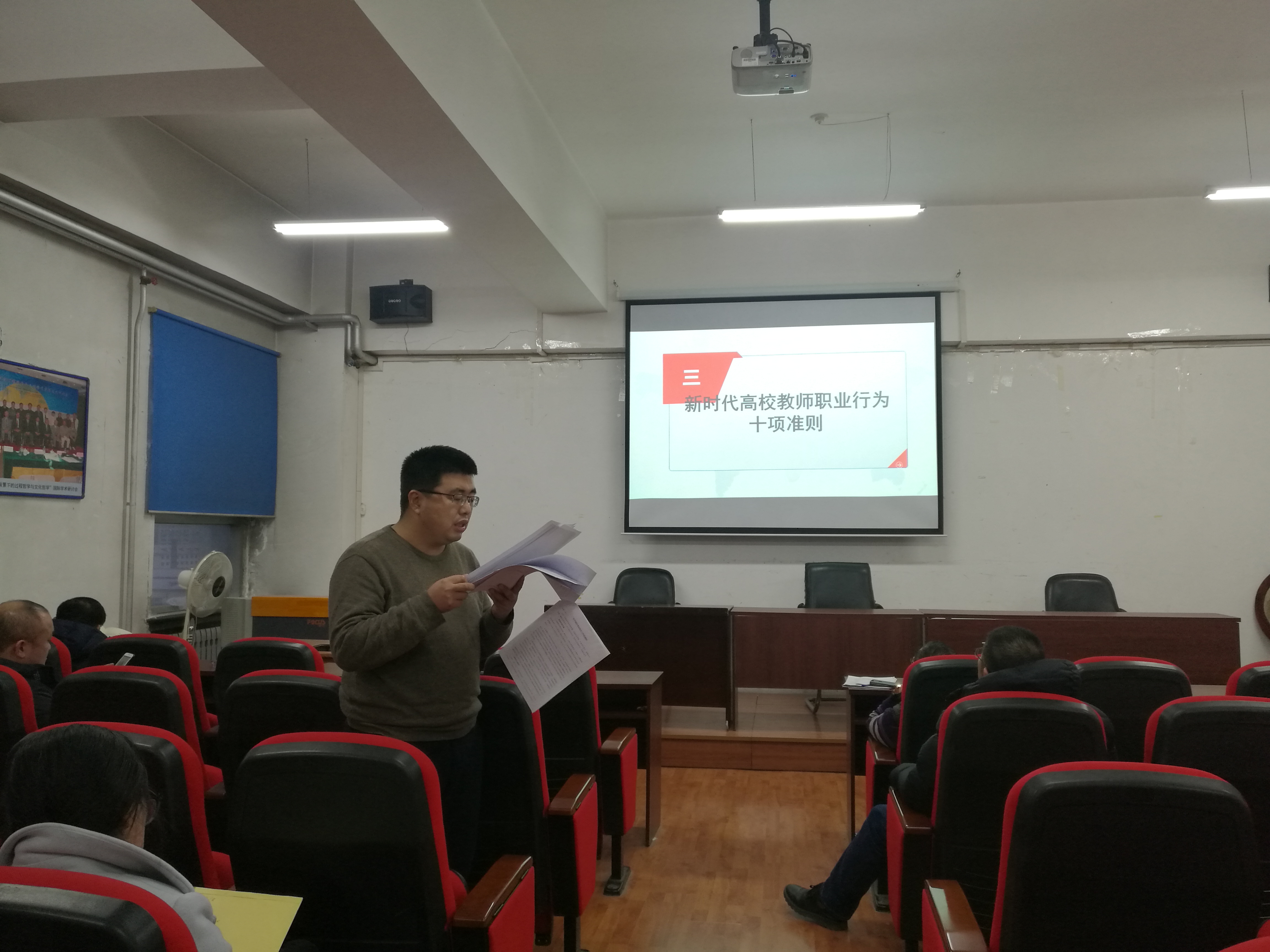 为进一步加强教师思想政治教育和师德师风建设,按照《公司党建实践活动月活动方案》安排,2018年12月12日14时,ladbrokes立博全体教师集中学习了《八项规定出台后严格禁止的财务行为80条》、《新时代高校教师职业行为十项准则》、《关于高校教师师德失范行为处理的意见》三项内容。