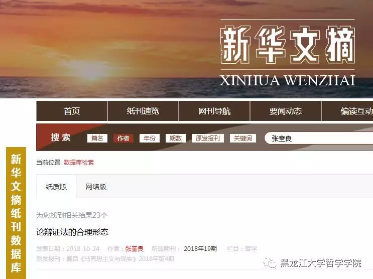 《新华文摘》作为大型理论性、综合性、资料性文摘类权威期刊,以其思想性、学术性、权威性和可读性享誉海内外,是我国最具影响的哲学社会科学文摘类杂志。其转载和摘编的哲学社会科学领域的新观点、新资料、新方法和文艺佳作的学术价值不言而喻。此次,《论辩证法的合理形态》一文的全文转载已是张奎良教授的文章,第23次被《新华文摘》全文转载或论点摘编。