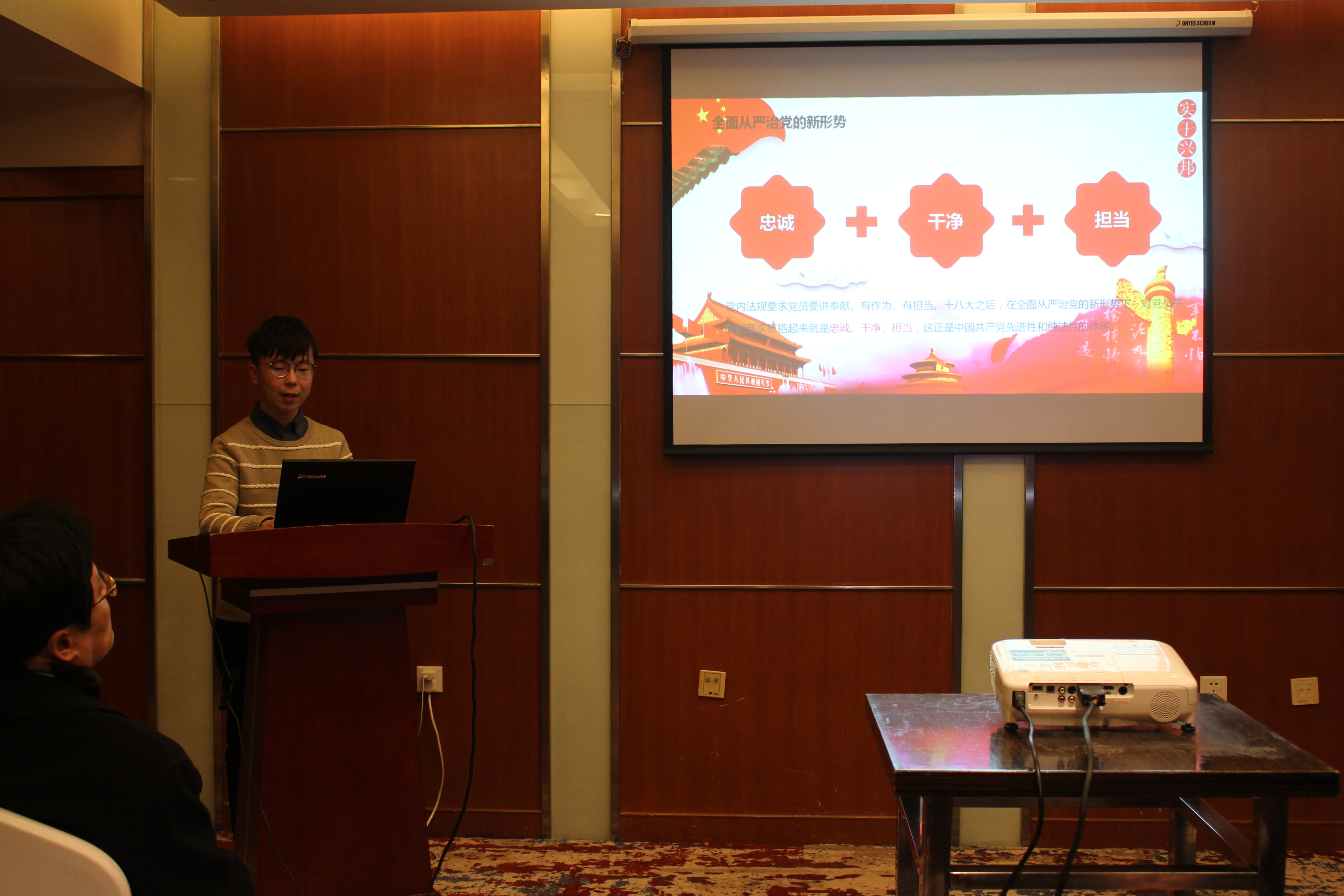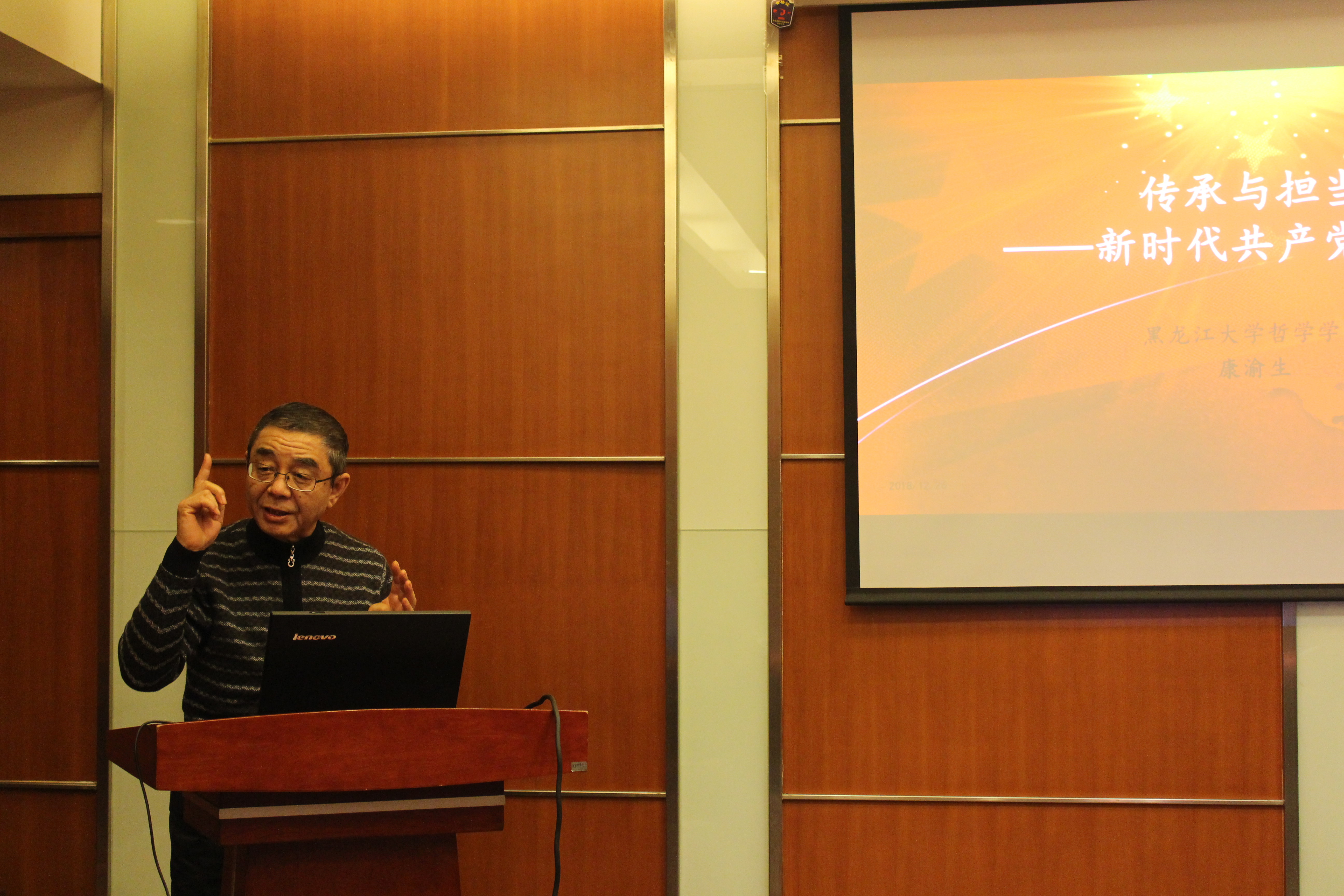 康渝生老师从他对改革开放40年以来国家在科技、文化、生活中发生的翻天覆地的变化的深切感受切入,讲解了“党的宗旨与我们的选择”、“思想传承与我们的修养”、“文化传承与我们的责任”以及“伦理传承与我们的担当”四部分内容。每一名共产党人都应坚定理想信念,每一名共产党人都应明确自身人生价值,每一名共产党人都应肩负历史的传承与担当。